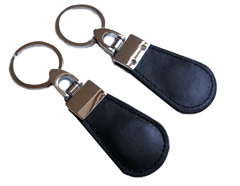 The upper part of the prestige key fob is made of stainless steel and the lower part is made of an imitation black leather plastic material. The total dimension including a ring is 85 x 35 mm.