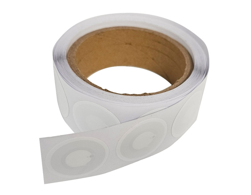 The top layer is made of white plastic material (PET), the middle layer contains the chip, and the bottom layer is adhesive.