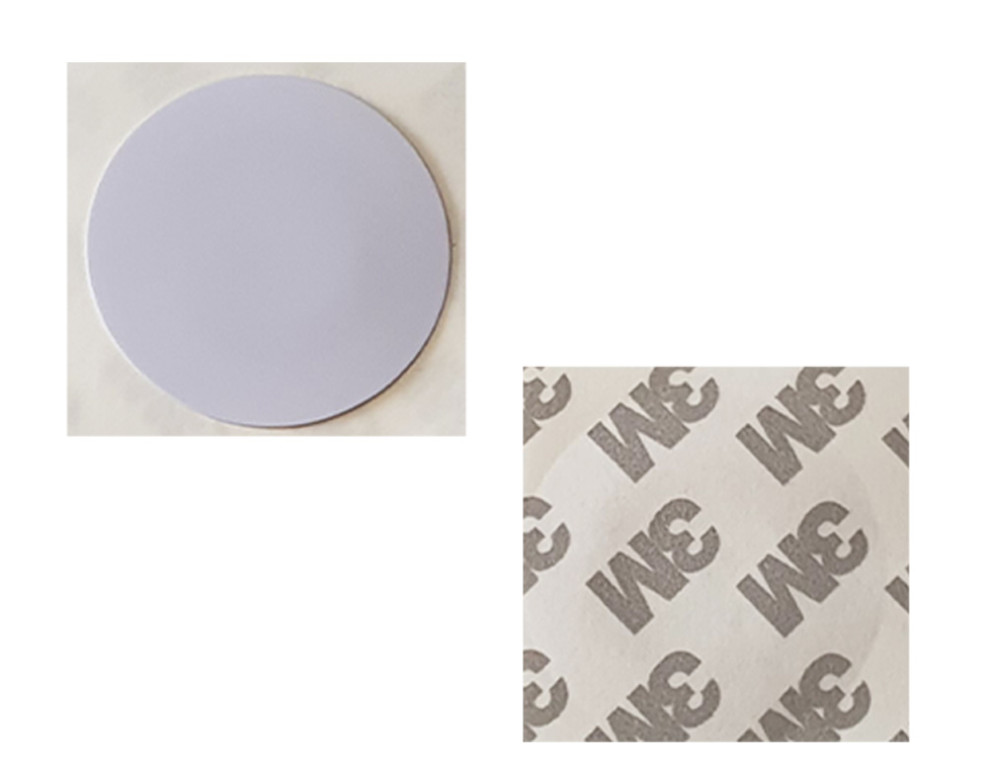 These 125 kHz stickers are waterproof, they have a diameter of 38 mm and they are approximately 1 mm thick.