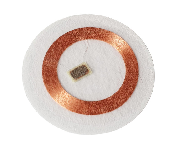 These RFID stickers are made from PVC, they have a diameter of 38 mm, and are approximately 1 mm thick. They are bright white, without numeration or other printed elements.
