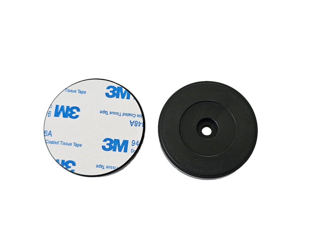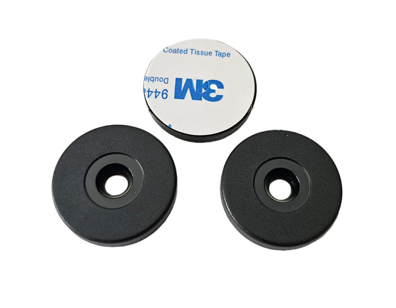 Robust NFC tags with the NTAG213 chip have a solid housing made of ABS material and a 8 mm hole for a screw or nail in the middle, and a strong 3M adhesive. They can be used even on metallic surfaces.