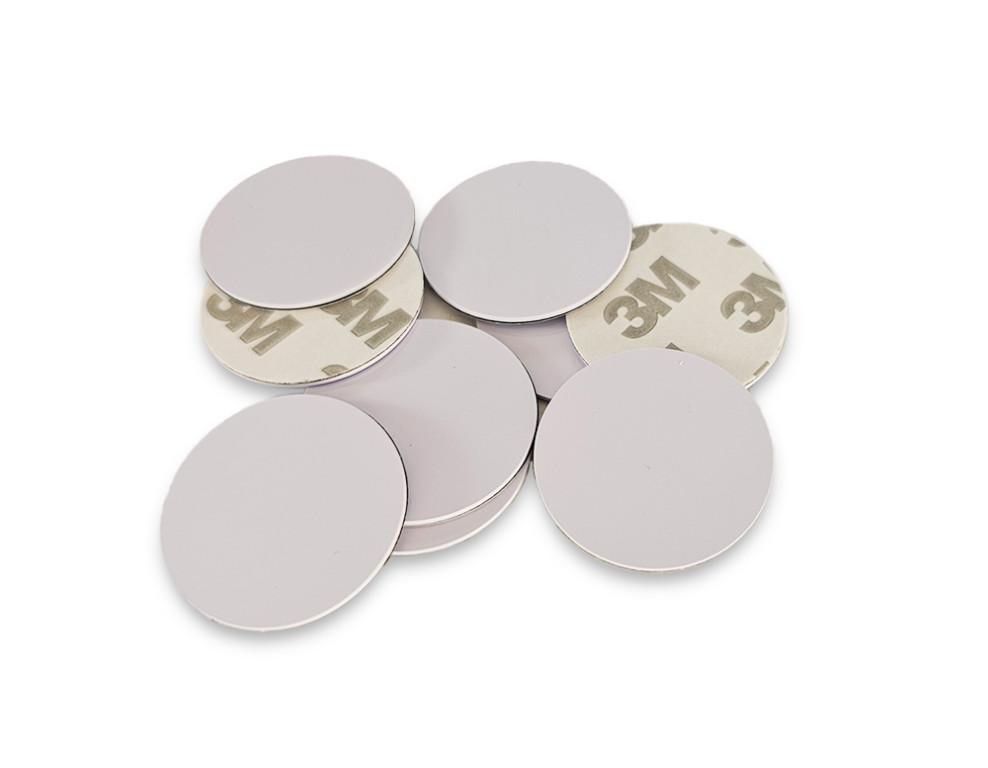 Sturdy RFID sticker shaped like a disc with 13.56MHz MIFARE Classic® EV1 1k chip and on-metal protection. This RFID tag measures 25 mm in diameter and comes with ferrite metal protection layer  for on-metal application and strong 3M glue.