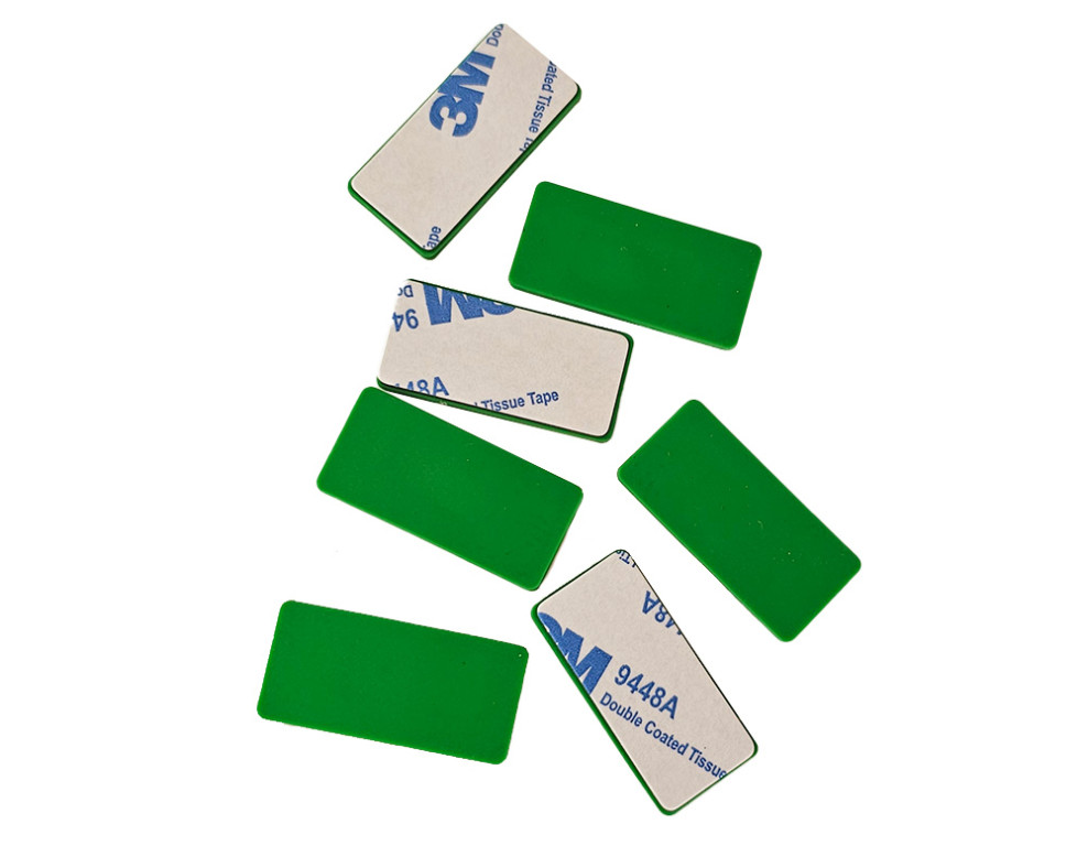 The silicone NFC stickers measure 34x16 mm and contain the commonly used NTAG213 NFC chip, along with a protective ferrite material layer, allowing for installation even on metallic surfaces, secured with durable 3M adhesive.
